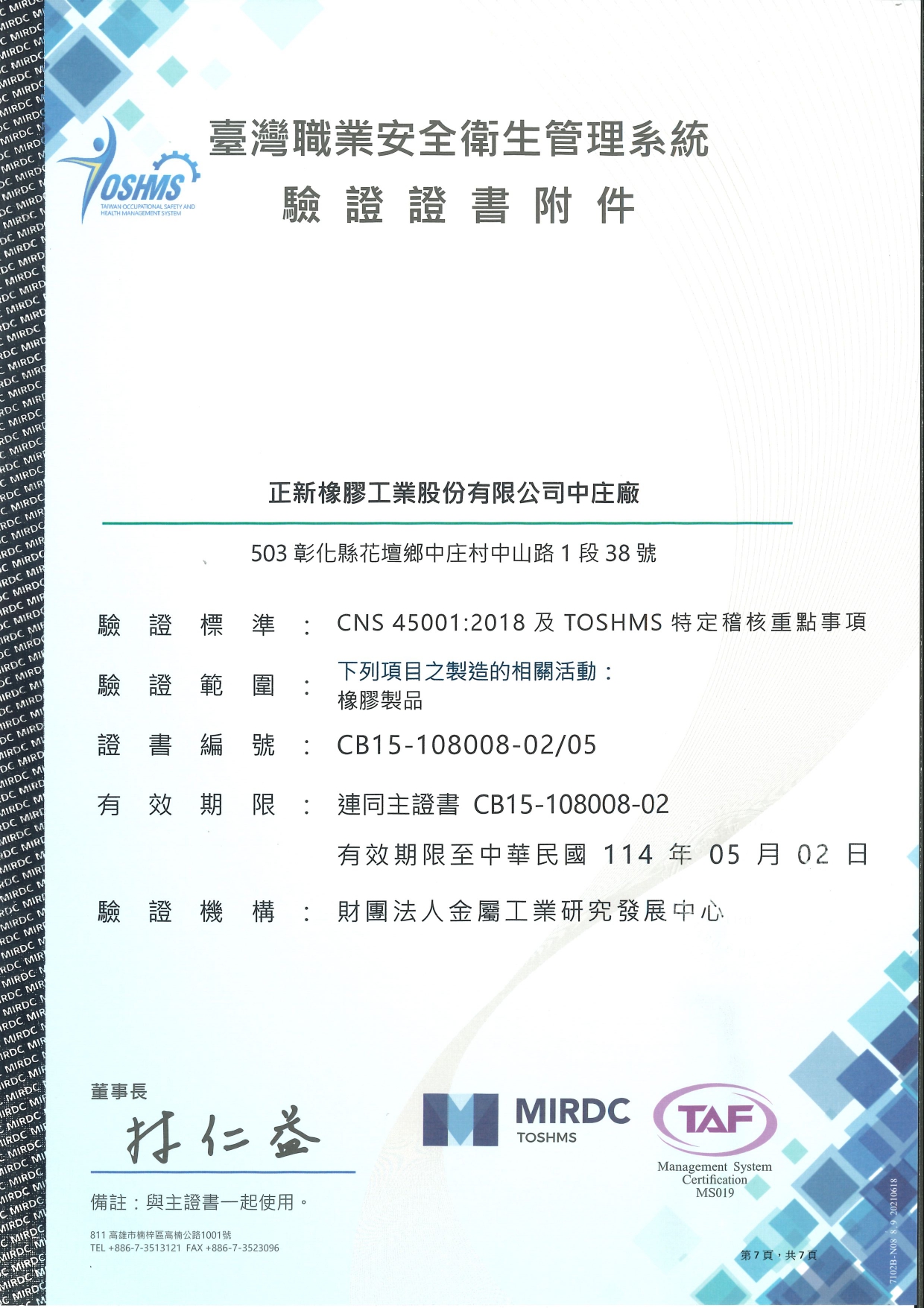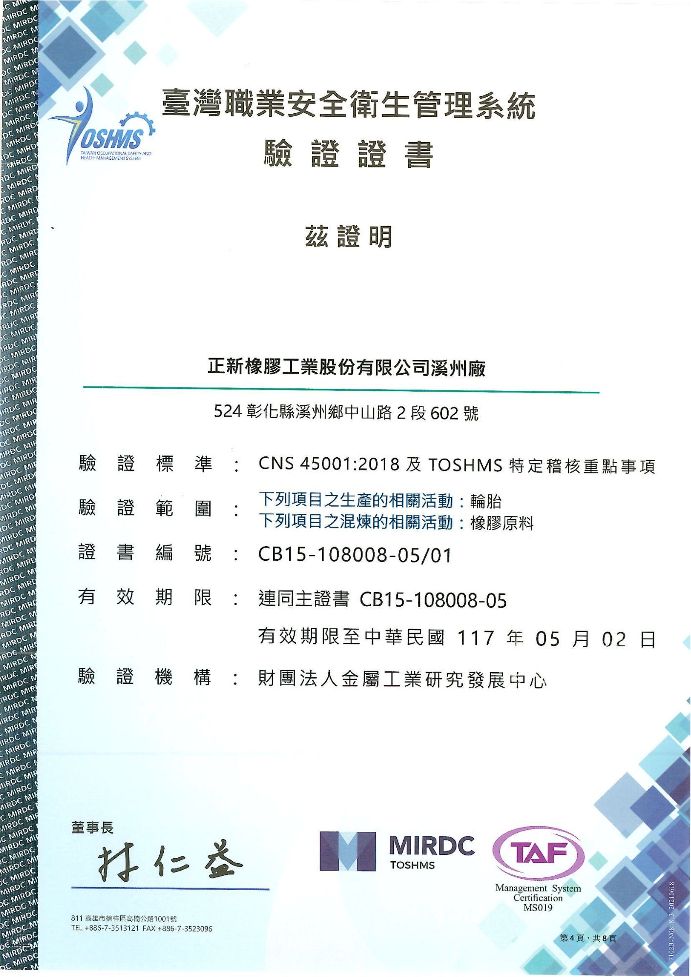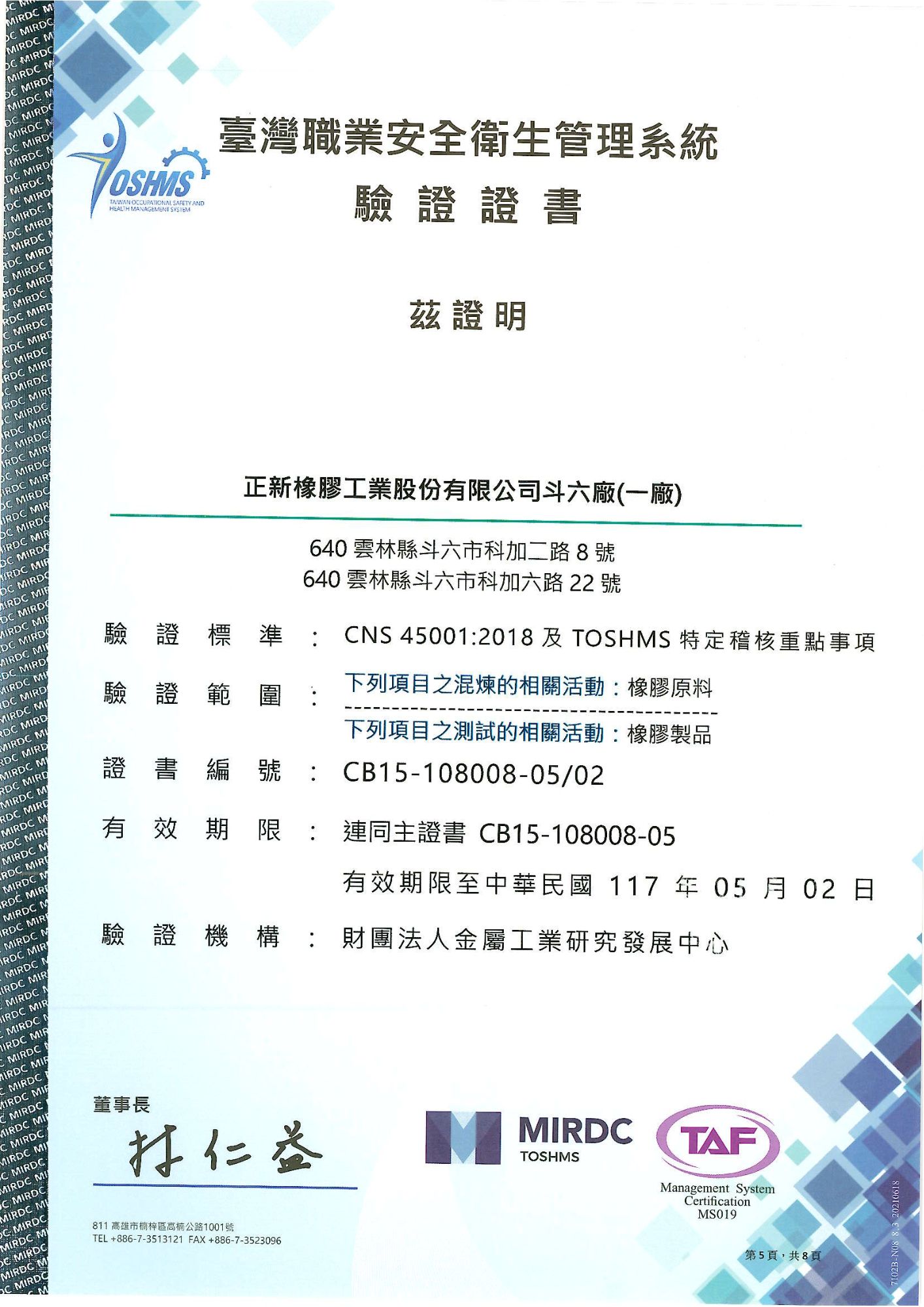 The certified sites include: Headquarters, Plant No. 3, Zhongzhuang Plant, Xizhou Plant, Douliu Plant No. 1, and Douliu Plant No. 2.